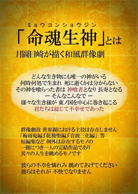 #夏の創作クラスタフォロー祭り #秋の創作クラスタフォロー祭り #一次創作クラスタフォロー祭 和風群像劇「命魂生神(ミョウコンショウジン)」 独自の世界や文化が存在し、様々な性や種族が生きる世界 君たちは総じて不幸せであった
