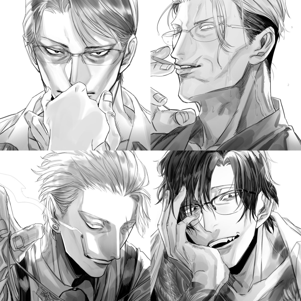#一次創作者のイケおじ好きによるイケおじ好きの性癖を爆発させるためのイケおじハッピーセット教えてください #いいおっさんの日 というわけで、うちの団長(グレン)・隊長(テオ)・謎の眼帯おっさん(ライル)・公爵(カイン)の四人の過去絵ポイッと( ・∀・)