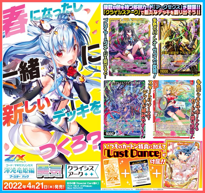 【新商品】 🌈#一緒にデッキを作ろう❗ 渾沌竜姫編 #勇気クライシスアーク 2022年4月21日(木)発売✨ ✅多色デッキが楽しく組める「クライシスアーク」が登場👑 ✅デッキ構築をサポートするカードが盛り沢山💫 ✅特別な「Last Dance」もカートン特典で付属💎 ▶️zxtcg.com/product/booste… #ZX_TCG