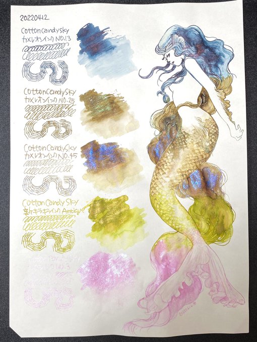 ハンドメイド作家さんのインクも面白い!キラッキラのラメインクで人魚描きました #インク沼 #万年筆インク #万年筆インクイラスト #ラメインク twitter.com/honnakotsu_yok…