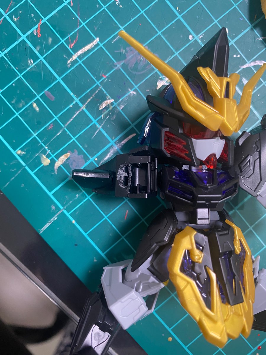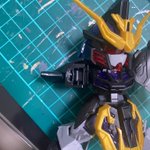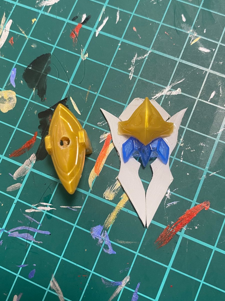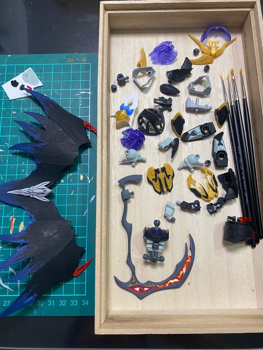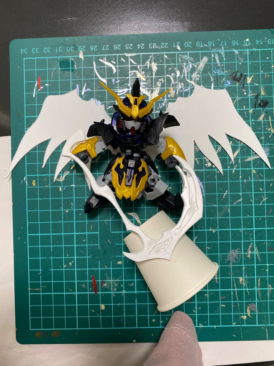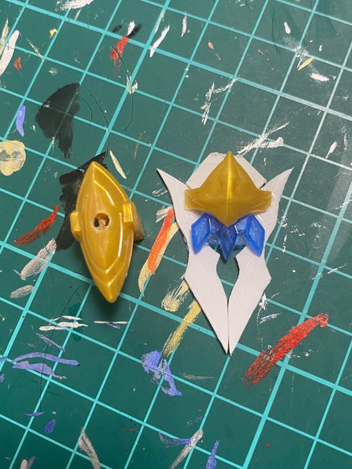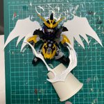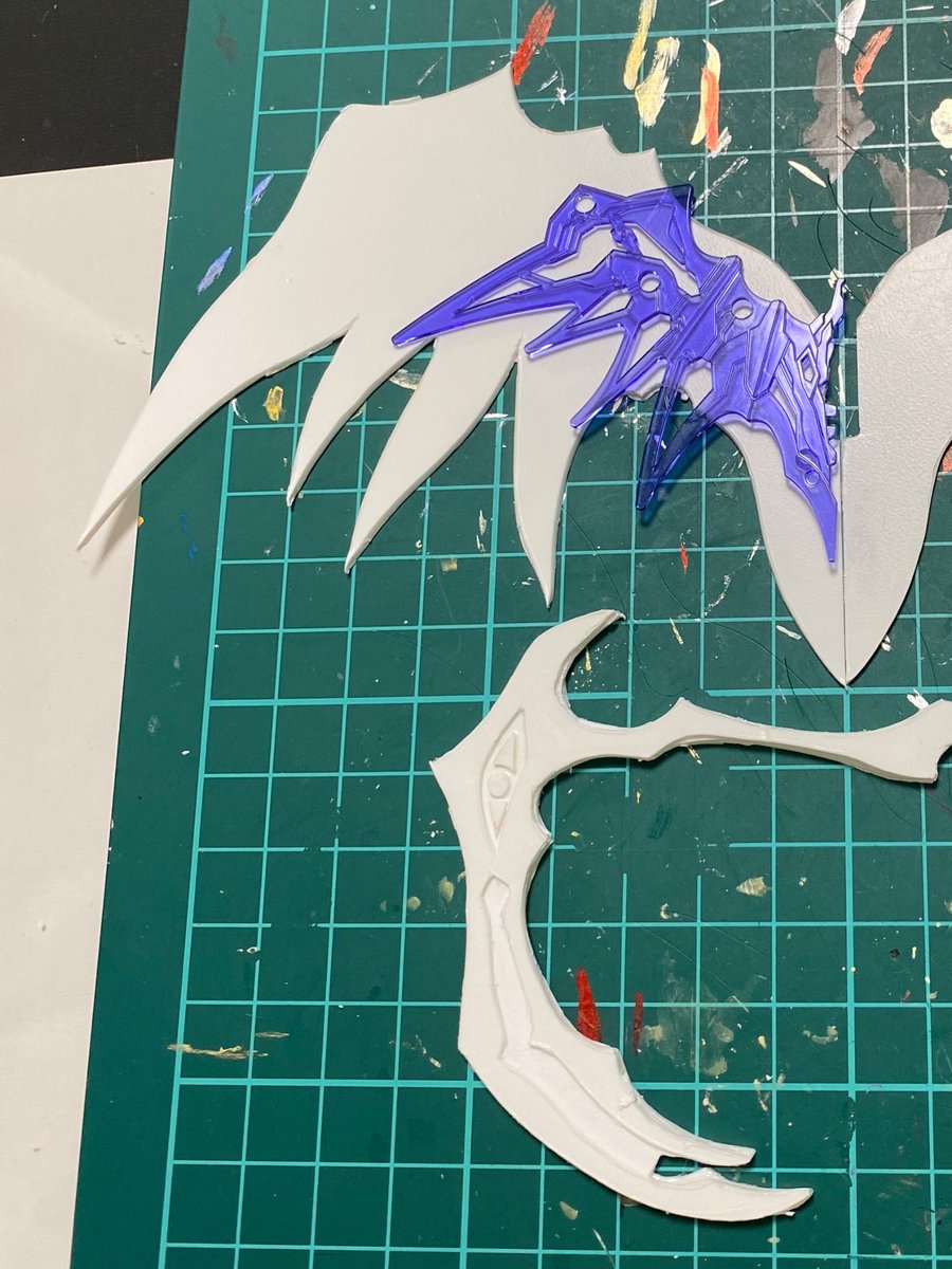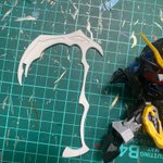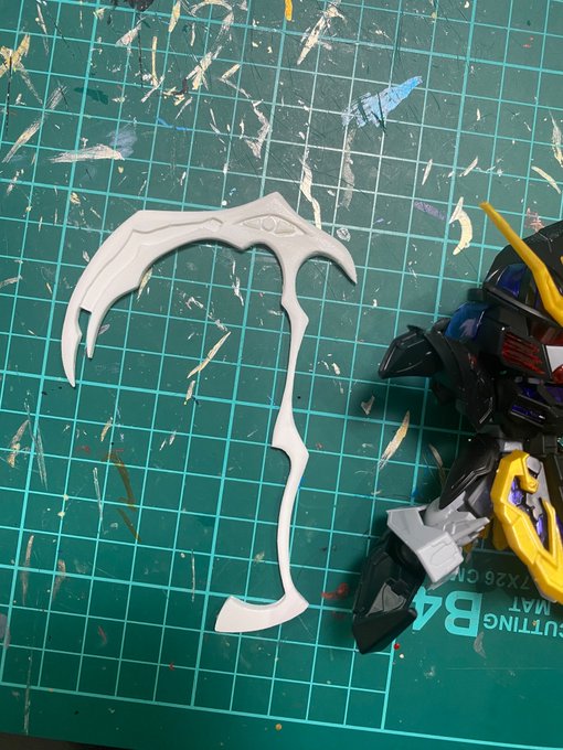 昼模活部 マント切り出し完了 元のマントと比べるとかなり巨大化 鎌は3枚重ねたのでこっからひたすら整形 眼も切り出して接着 バスター盾は腕アーマーが大きいため、バランス考えると無しでいいかもと #三国創傑伝 #ガンプラ好きと繋がりたい