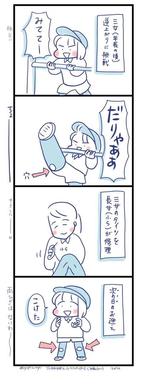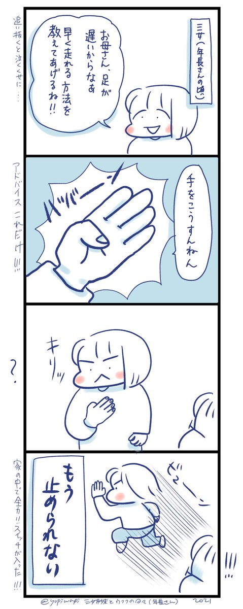 三女から早く走れるアドバイスをもらった話 #三姉妹とウフフの日々 #育児 #育児漫画 #育児日記 #4コマ漫画 #漫画 #マンガ #エッセイ #漫画が読めるハッシュタグ #みんなで楽しむTwitter展覧会
