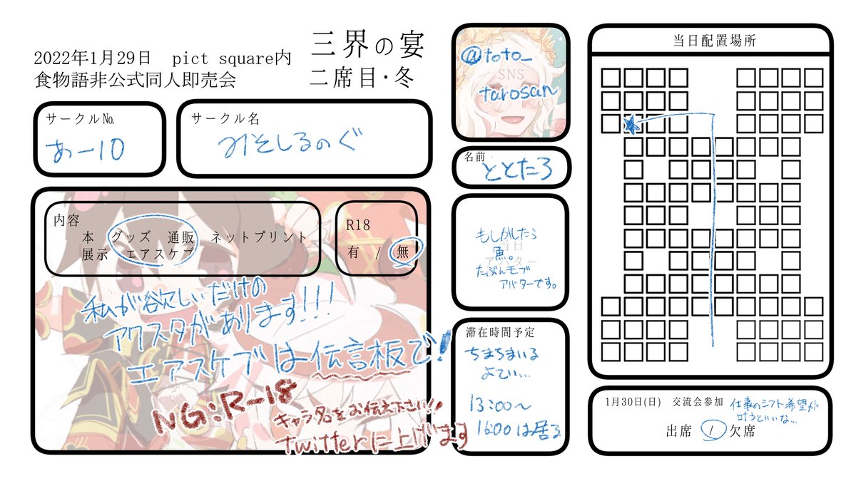 仮サクカで失礼します。 29日は【あー10】に配置されました!「アート」ですね!当日はエアスケブも受ける予定です! ショップ「renshunmi.booth.pm」 詳細はお品書きのとおりです。アクスタの写真は下につなげます。何卒よろしくお願いします! #宴お品書き掲載可 #三界の宴二席目