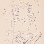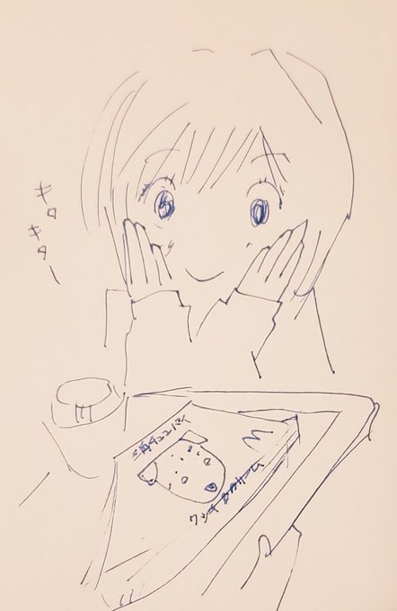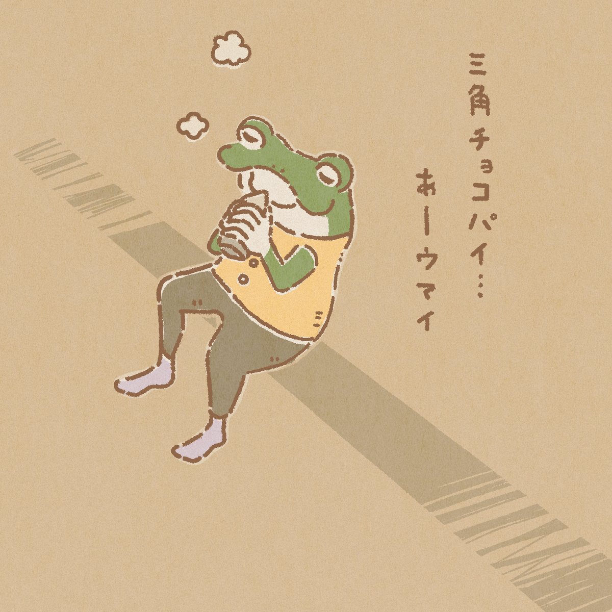 #三角チョコパイ の季節きまひたー! 普段あんまり甘いもの食べない嫁さんだけど、散歩の途中で寄ったマックで見つけてうひょひょー!ってなってます。ワンパンマンのキングも言ってたけど糖分って本当に大事なんだなって。 アツアツのうちにどうぞー! #イラスト #イラスト好きさんと繋がりたい