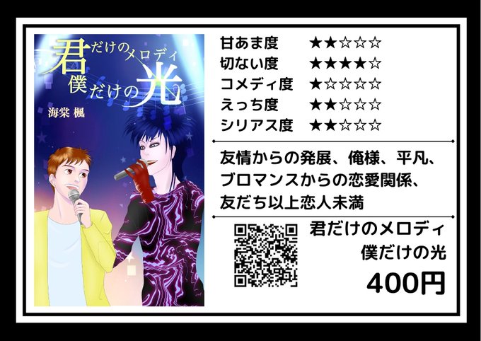 #三連休のお供に私の創作小説読んでみませんか #創作BL #KindleUnlimited ヴィジュアル系バンドマンと平凡第一のサラリーマン。いつしか友情とは異なる想いへ…。 唯我独尊俺様キャラと、自分に自信を持てない卑屈キャラが織りなす、友情から始まるちょっともどかしい恋物語。 amazon.co.jp/dp/B084H6TSBN/