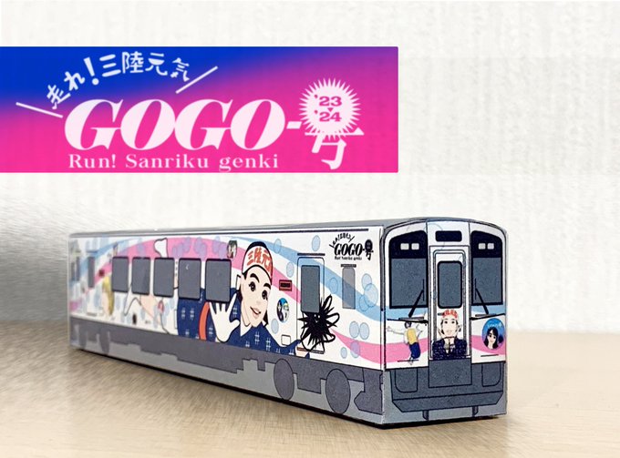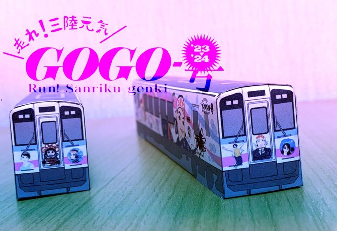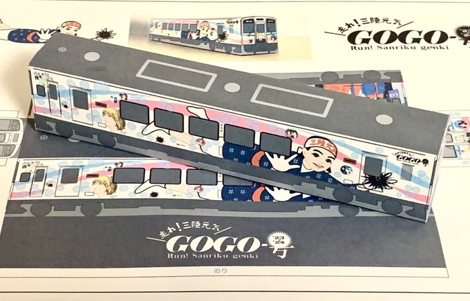 #三陸元気GoGo号 #ペーパークラフト は三陸を駆け巡る最終デザインのものになりますよ! 支援額は2枚で2,500円です。 ご覧の写真のように遊べます🚃🚃 実際のラッピングカーは1台だけだけど、ペパクラでご自由に #妄想トレイン 遊びをしてください🤭 他のリターン品もチェックしてください‼️ twitter.com/HakuM35/stat…