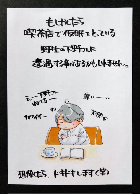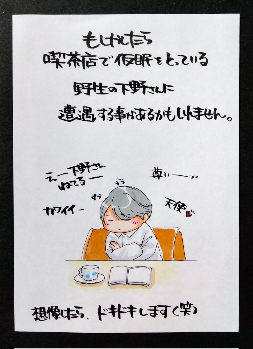 下野さんの日常 「喫茶店で出逢う可能性」 コート姿可愛かったなぁ🧡コート脱いだ時(*´ω`*)🧡だったなぁ(笑) まさか仮眠に喫茶店を使うとは思わなかったなぁ。しかしまた聖地が出来ちゃったなぁ(*´∀`)ミンナイクノ~? #下野紘 #下野内田と夜あそび #イラスト 返信な〜い