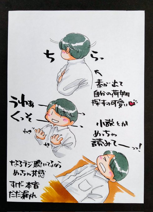 下野さんの日常 「寛げる空間で小説読みたい」 ここ永遠に観てられる🧡(*´ω`*)素の動作と本音だだ漏れで可愛すぎる 斜め後ろからの後頭部も良き🧡 この回の髪型ショタみがあって好き #下野紘 #下野内田と夜あそび #イラスト シカシ…ホントスナオダナ 返信ない