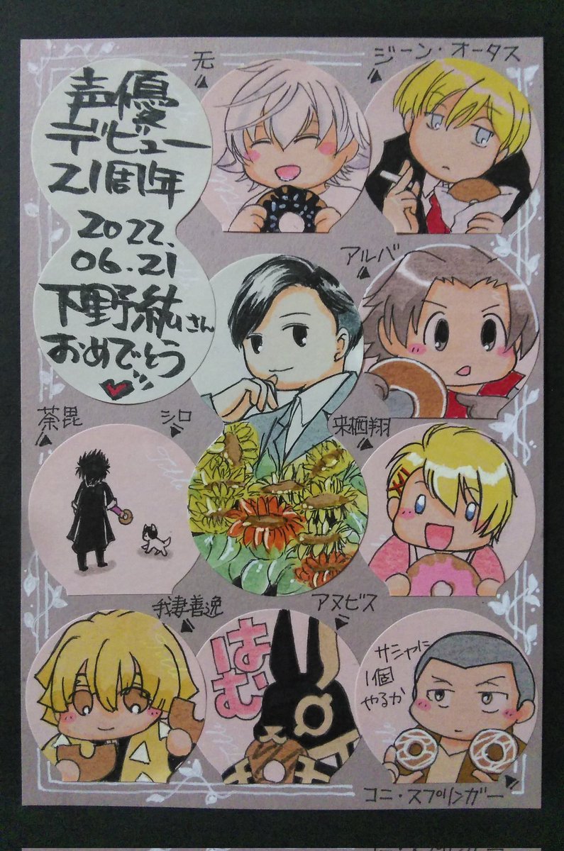 声優デビュー21周年おめでとうございますっ! 今まで寄り添ってきた子達は何があろうと無敵の味方として下野さんのそばにいてくれてこれから先も絶対大丈夫。 そんな下野さんを応援できてこれ以上の幸せはないです! 下野さんに幸多からんことを! #下野紘声優デビュー21周年 #下野紘 #イラスト