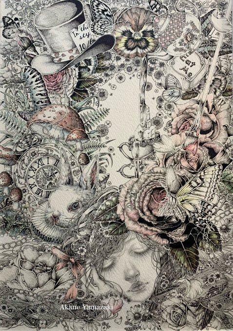 花と飾り枠描くの大変で不思議の国のアリス、スクリーンデビューに間に合わなかったけど見て欲しい😭アルフォンス・ミュシャ作品「夢想」をオマージュ。「夢想」という題名も、不思議な夢の国を想像していたアリスに合っていると思う🌹#disney #ディズニー #不思議の国のアリス #AliceInWonderland
