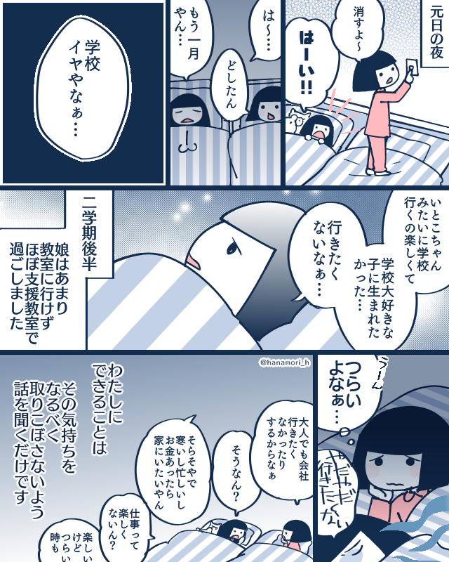 冬休み終盤のこの時期、きっと全国あちこちで「学校に行きたくない」と心を曇らせる子供たちのことを考えるだけで心が痛い…… (誤字があったので再投稿しました。すいません) #コミックエッセイ #漫画が読めるハッシュタグ #不登校の親