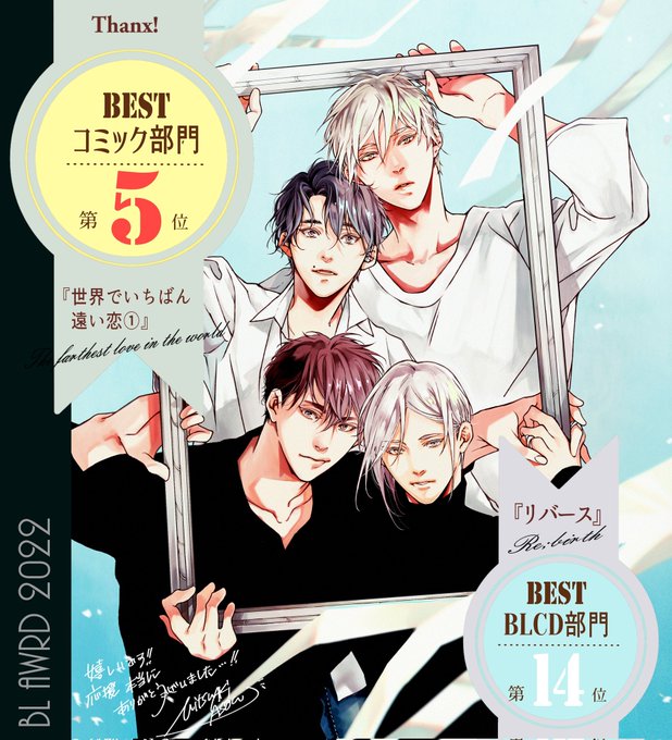 ◤#BLアワード2022◢ BEST コミック 👑5位👑 ↳『#世界でいちばん遠い恋』 bestCD 👑14位👑 ↳『#リバース』 改めましてご投票・応援を本当にありがとうございました𓅼 自分も楽しく、何より皆様が楽しいBLを目指しこれからも頑張ります…!