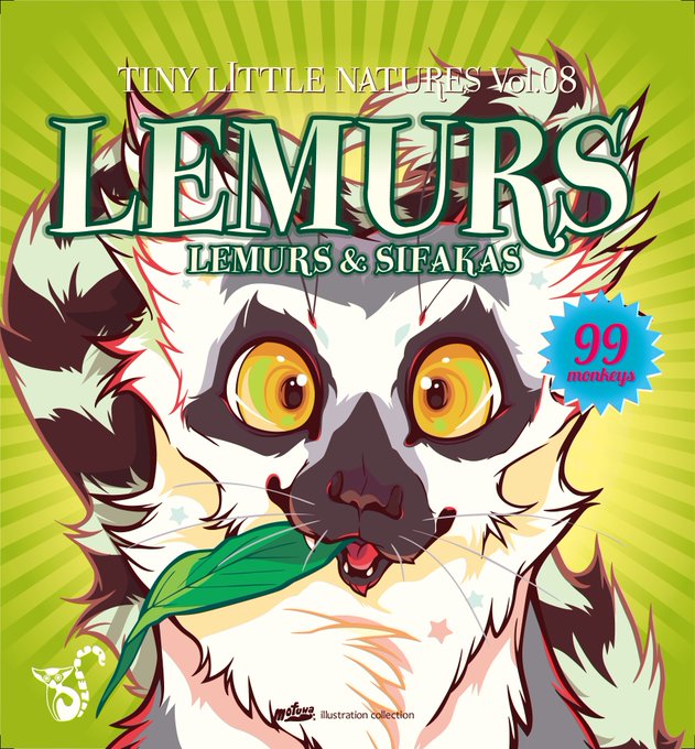 #世界キツネザルの日 ‼️ キツネザル目の仲間は本当に面白かわいい🌴長いしっぽと、機敏な動きで、ポーズのバリエーション描いててたのしすぎた……… で、99 種を全部描きました😂 この本も #いきもにあ に持っていくぞ〜‼️ #worldlemurday #ワオキツネザル #ringtailedlemur