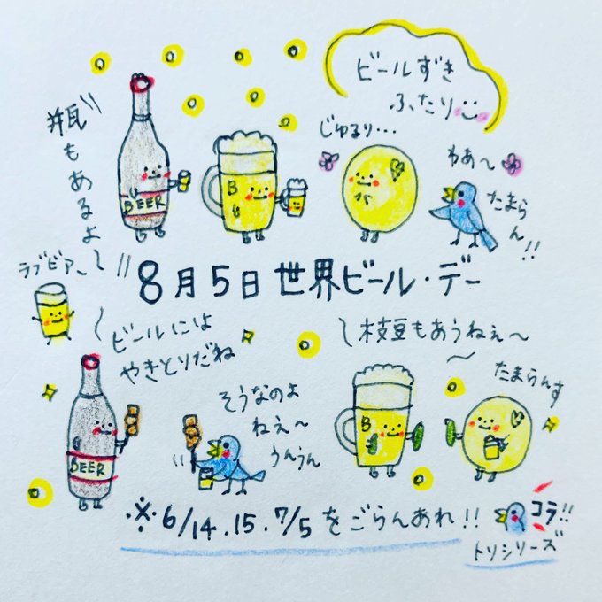 8月第一金曜日は #世界ビール・デー🍺 なので今年は8月4日♬ 🍺٩(´ω`*)و✧*。 手頃な値段でさまざまなクラフトビールが気軽に飲める、ありがたい時代になりましたねえ。 #1日一点とにかく描く #今日は何の日 #酒なくてなんの人生ほにゃららら
