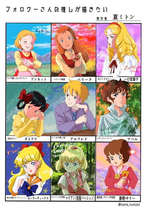 #フォロワーさんの推しが描きたい #世界名作劇場 他 お待たせしてすみません🙇🏻♀️❗️(@はとりあえず付けませんが依頼主様に届きますように...!) コメント消えちゃった方もいますがこの9名で描かせて頂きました🙌🏻 キャラごとにあまり時間かけれなくてすみません💦 twitter.com/summer_mitte…