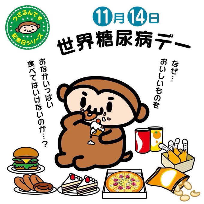 ♪( ´▽`)11月14日は世界糖尿病デー。今日は糖尿病の世界的脅威を認知するための国際デーなんですって。美味しいものをおなかいっぱい食べたいですよね。でも美味しい食べ物は糖分が多いです。糖分の取りすぎには注意して糖尿病を予防しましょうね〜! #世界糖尿病デー #イラスト好きな人と繋がりたい