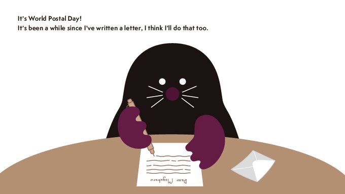 モグモグー。今日は世界郵便デー!ボクも久しぶりにお手紙を書いてみようかな。 #世界郵便デー #モグハル #Moguharu #もぐら #キャラクター #character #イラスト好きな人と繋がりたい #イラスト #illustration #デザイン
