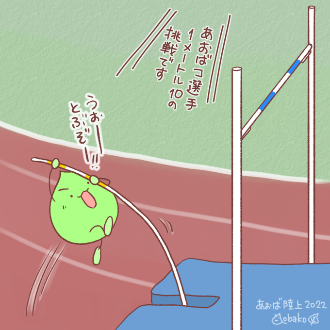おはばコ~☀️ 今開催してる #世界陸上 に影響を受けて棒高跳びをやってみようと思ったんだ!! 初めてだけど…上手に飛べるかなぁ(*´д`*) #あおばコの身長は約30cm #1m超えはなかなか高い #あおばコ #一日一絵 #あおばコ#棒高跳び #ゆるいイラスト #イラスト #OCイラS #みんなで楽しむTwitter展覧会