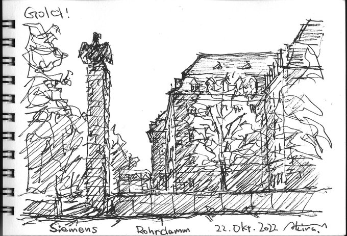 Goldener Oktober, Rohrdamm 金色の10月 Mini #Skizzenblock 10x15cm #Spandau #Siemens #ジーメンス #Kunst #art #Berlin #Zeichnung #drawing #アート #ペン画 #スケッチ #akiranakao #クロッキー帳 #中尾成 akira-berlin.de