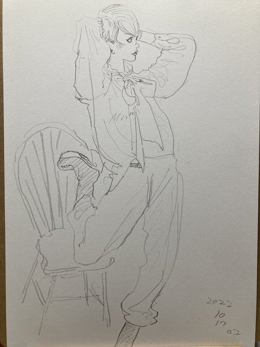 見下しているように見上げている、結膜部が真っ白の黒い瞳。この瞬間にしか出来ない目。 その目つきを時間内には描けず、持ち帰りで挑んでみました。 #中野ファッションクロッキー #FashionCroquisNzero #クロッキー #croquis #イラスト #illustration #デッサン #日々描く