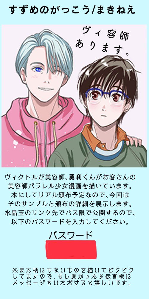 #二人のCompulsory サンプルとお品書きです。頒布等のお知らせもサンプルに繋げてます。 スペースのお品書きのパスワードを確認してから店舗中央の水晶をタップしてください。 会場入り口は引用ツイートに載せてます。 本日は予定通り開始時間22時から展示開始しますのでよろしくお願いします。 twitter.com/makisuzume/sta…