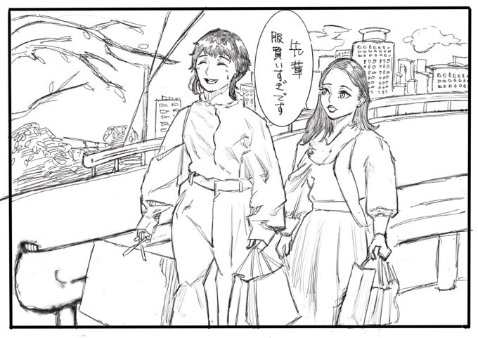 制作二時間少々…といったところ。背景はもっと勉強しなきゃなぁ〜 #二人一緒にお買い物 #コルクラボマンガ専科 …後輩ちゃんは可愛く描けたので良しとしよう。うん。あと背景は聖蹟桜ヶ丘で撮影した写真を見ながら、ざっくり模写しました。この景色がよかったのですよ(^^) twitter.com/i/web/status/1…