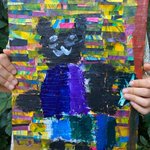 井口さんお誕生日おめでとうございます。 7歳娘が作った、いぐちさんをクマで表現したファンアートです。 娘がマーブリングした紙を小さく切って、キャンバスに1枚1枚貼り付け、その上に絵を描きました。 いつまでも娘の王子様で居てあげてください🙏 #井口理誕生祭2022 #井口理