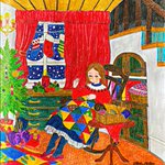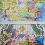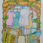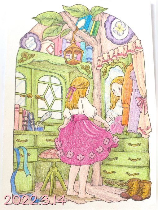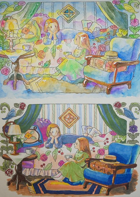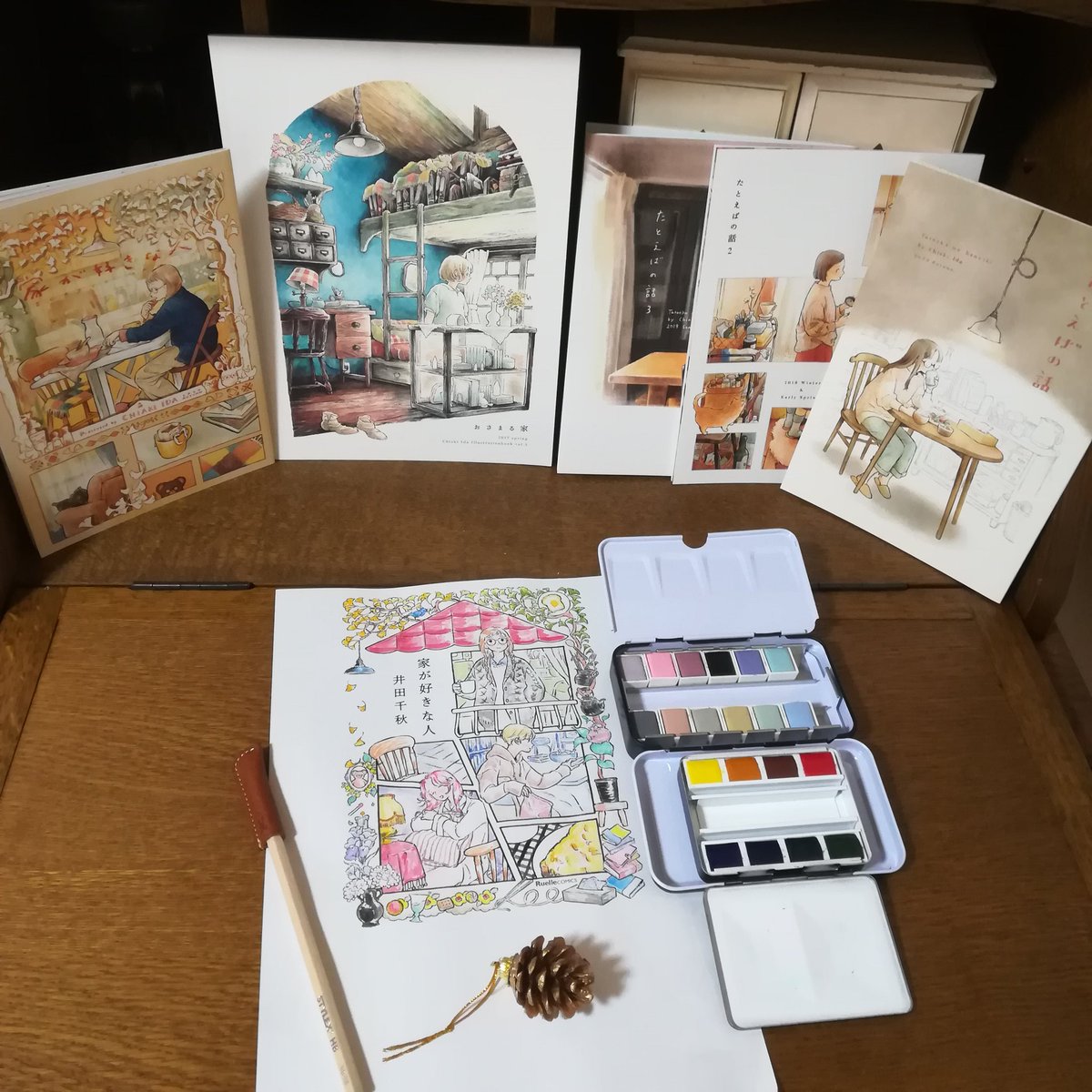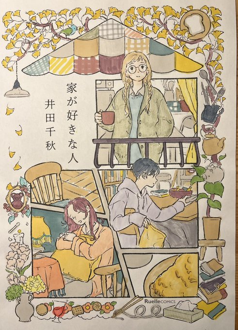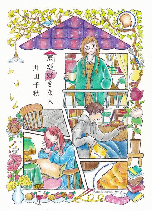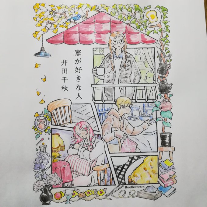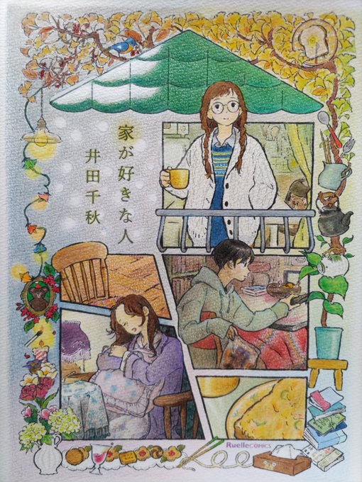 #井田千秋 先生の、 #家が好きな人塗り絵 に参加です! ぎりぎり間に合った~😅 #家が好きな人 の世界観を大きく変えないように気をつけつつ、楽しませて頂きました!本当にいい絵だなあ~とうっとりしながら塗りました。春夏秋冬、楽しく暮らしているイメージにしました。続く