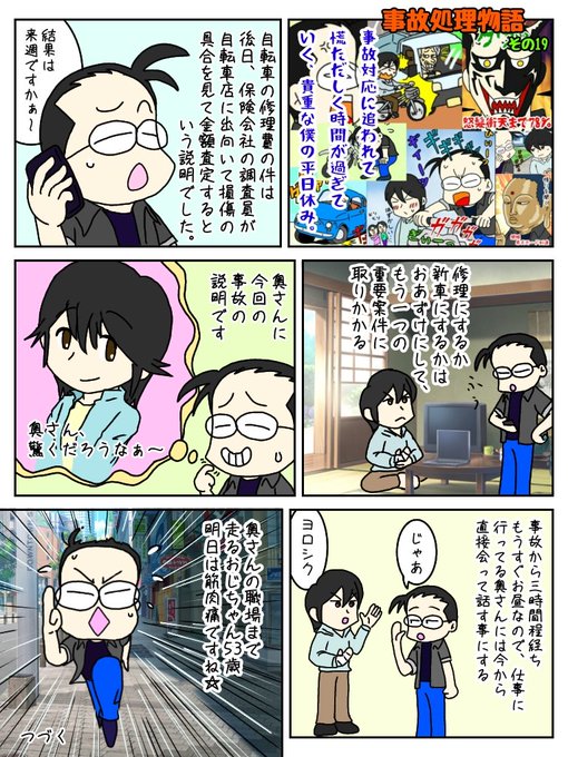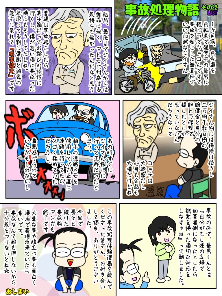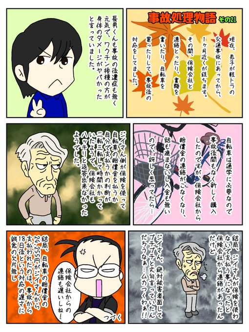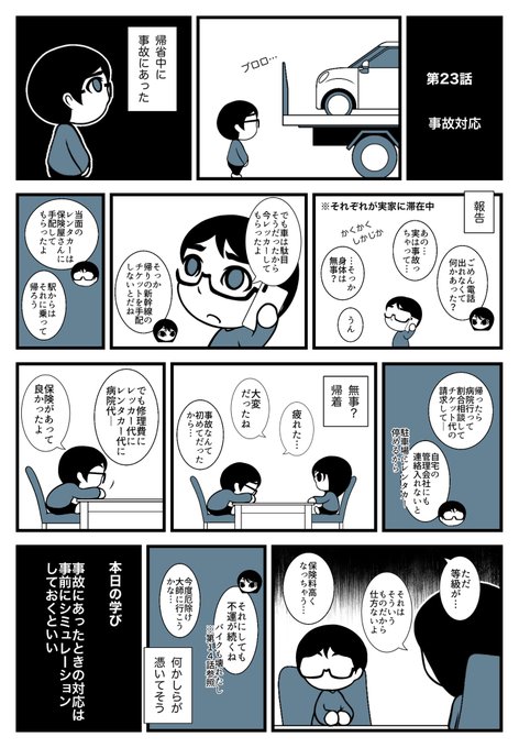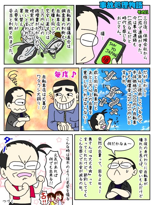 信号無視の高齢者様に轢かれた夫が逆ギレされた経験があったので、私もクラクション鳴らしてれば回避できたかなぁ…とウジウジ悩んでいたら、あっさり解決してしまい、自動車保険のチカラ…というか、ちゃんとした方と事故してよかったなと…😂 #たんこんち #交通事故 #漫画が読めるハッシュタグ