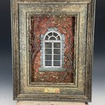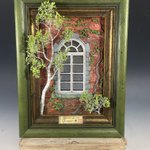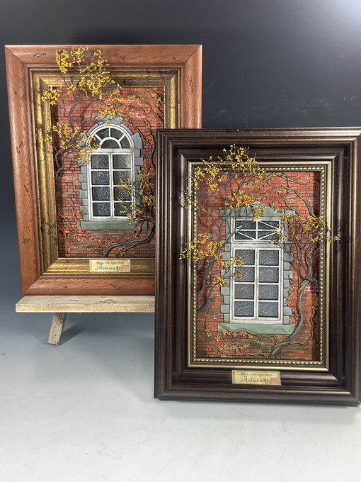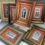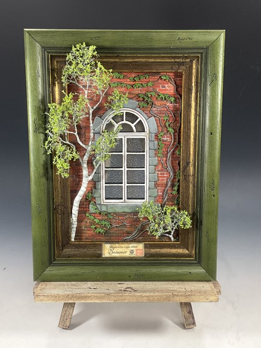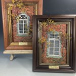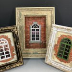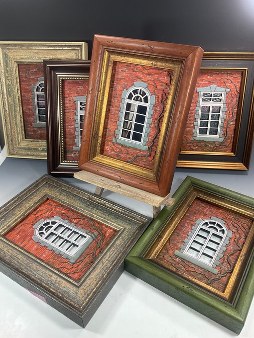販売用フレームアート、やっと一個目塗装終了、これから木立と枝をあしらいます。 お手軽実演のサンプルも二種完成しました、こちらは窓ガラス部分を鏡にしていますのですこっつの手が移り込んでますねw #京王ドールハウス展 #フレームアート