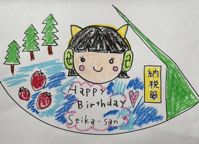セイカさんお誕生日おめでとうイラスト🍾10周年だし私も記念にってことで初めて描いた😆😆😆😆😆 メタセコイヤとイチゴと日時計と納税!笑 #京町セイカ #京町セイカ10周年 #京町セイカ生誕祭2023