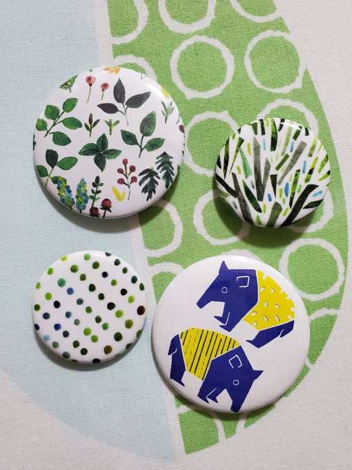 12/11(日)京都ハンドメイドマルシェに一緒に参加するmidoriさん(@mido_ddoo)の缶バッジを先行GET! 北欧のような、植物園のようなイラストがすっごく素敵〜🌿🍀☘️ 私の『夢見るバク』バッジと一緒に記念撮影📸 #イラスト #京都ハンドメイドマルシェ #缶バッジ