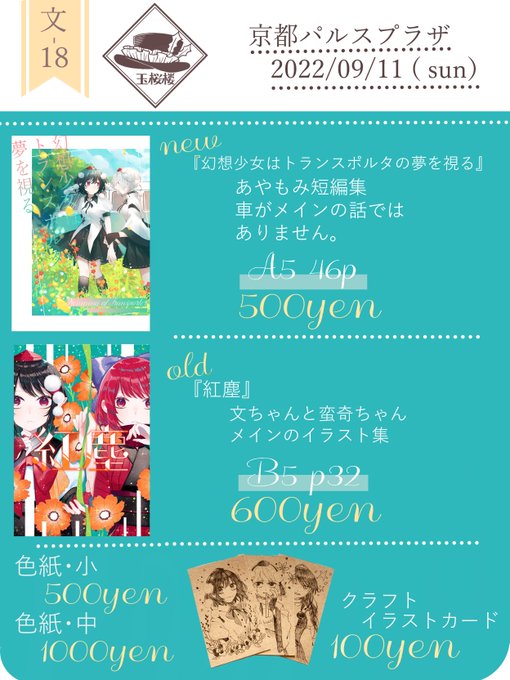 9/11 #科学世紀のカフェテラス 【封01】吉田屋。 おしながきです。新刊あります。新作グッズはミニメモ。 在庫ある本はすべて持っていきます。どうぞよしなに。 #酉京都2022 #酉京都2022告知 #京都秘封 #京都合同