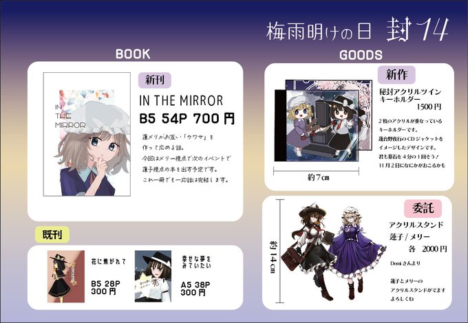 明日の京都秘封お品書きです〜!!新刊とアクキーがでます! なんとDemiさん(@Demi64bit)のアクスタもあるよ!!☺️ 余力があれば色紙もあるかもしれないです。🦆 #京都合同 #科学世紀のカフェテラス