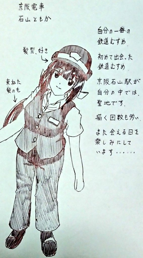 京阪電車の石山ともかちゃんを描いた。 リクエスト、ありがとうございます。 一発ボールペン描き。 手を失敗したから、また描こう。 明日は休みです。 小休止出来ます。 #鉄むす版深夜の真剣お絵描き60分一本勝負 #鉄道むすめ #京阪電車