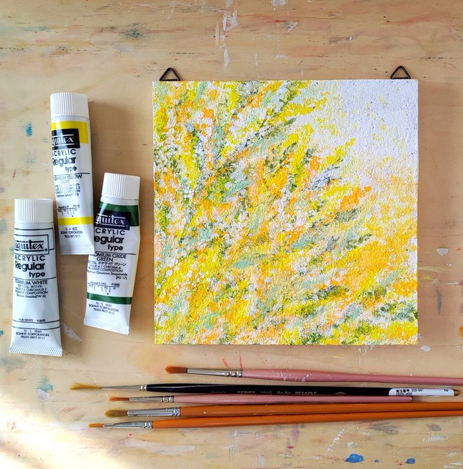 寒いからかな? 春の花、ミモザが人気です🌼 黄色は暖かくてほっこりします☺️ #ミモザ #インテリア雑貨 #人気商品 #私の_世界に一つだけの花 #黄色 #art #原画 特集掲載「春待ち・ミモザ」コルクボードの原画*壁飾り minne.com/items/26149931