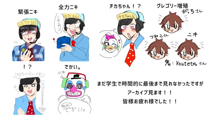 今回二回目の支援イラストです!今回はいろんなシーンを切り取って描いてみました!!! (お疲れ様でしたって描いてあるけど今投稿したらおかしいですね…11:00現在) #FNAF #イシイニキ #FNAFRADIO #fnafsecuritybreach #ガッチマン #人生つみこ #koutetsu