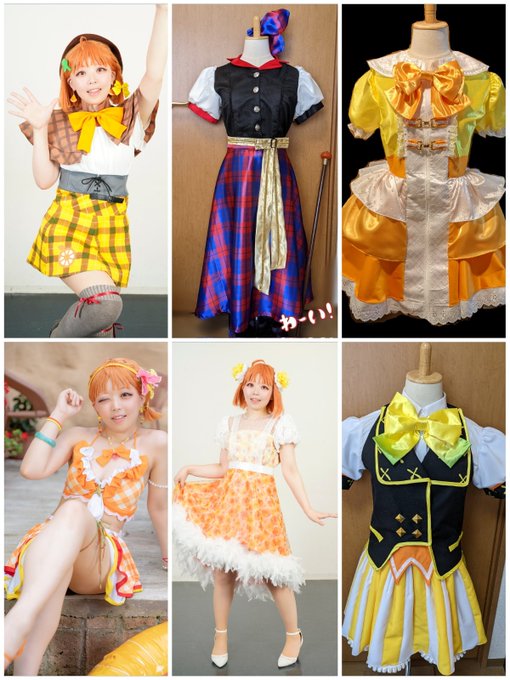 全部千歌ちゃん🍊 夏に製作が集中しててキツかった🫣 1番こだわったのはNever giving up!のスカート生地の光沢感✨ 作業的にしんどかったのは脱出ゲーム衣装の生地の柄を1から錬成したこと、OKAWARI時間なくて3日で作ったこと…かな…来年は計画的に… #今年一番気合い入れて作ったコスプレ衣装見せて