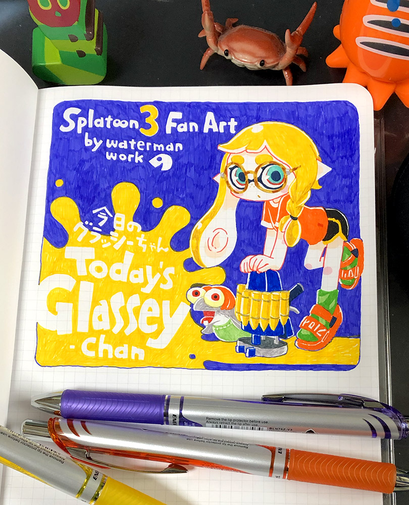 久しぶりにボールペンで描きました。 今日は遠く離れた友達が電車でやってくるとのことで、駅でソワソワしながら待っているグラッシーちゃんです。 #スプラトゥーン3 #Splatoon3 #今日のグラッシーちゃん