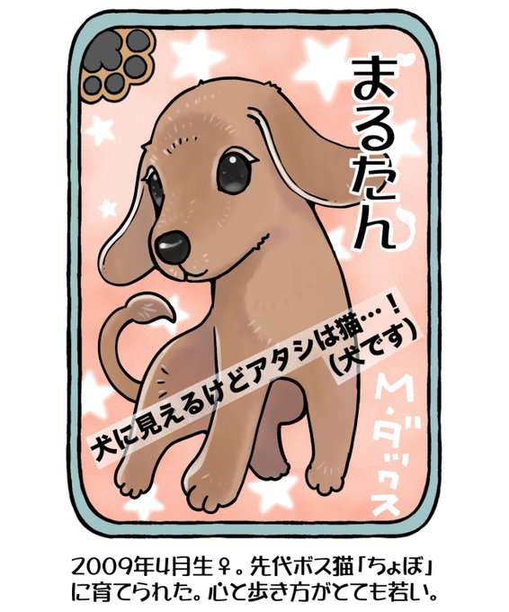 #今日の山野絵 #山野家登場犬猫紹介カード 固定ツイ用に今日から毎日(たぶん…)更新します。 1日目は最年長の「まるたん」現在14才。 人間と猫が大好き。 特に仲良しなのは小麦小梅海きゅんねねこちゃん。 明日は小麦氏です🐈