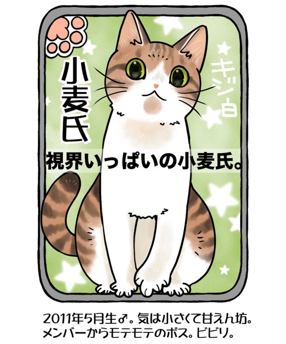 #今日の山野絵 #山野家登場犬猫紹介カード 2日目は小麦氏🐈 メンバー全員から好かれているのに、小麦が認めているのは まるたん、小梅、海きゅんくらい。後はシャー言い散らかしてるのに何故かモテる…🤔 人間の目の前に陣取るのが得意です。 明日は小梅たん❗