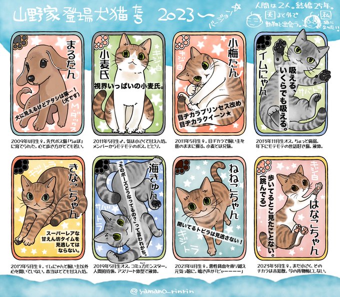 #今日の山野絵 #山野家登場犬猫紹介カード 1日1匹紹介したので、まとめをアップします。 現在の山野家、1わん7にゃん2人です。 どうぞよろしくお願いいたします~🙏✨ リプ欄に続きます→