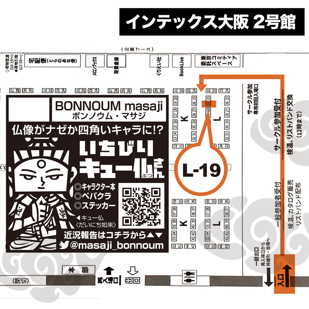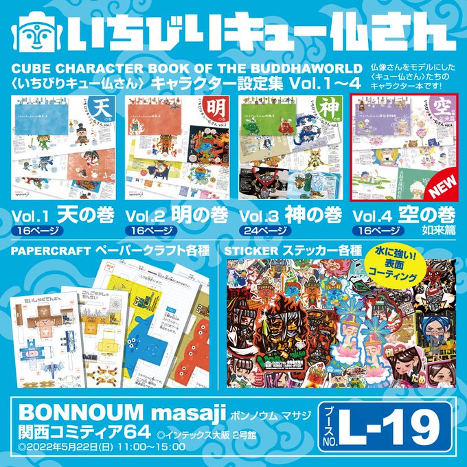 いよいよ5/22(日)は #関西コミティア64 です! キュー仏本は既刊を含め、新刊「空の巻・如来篇」も持っていきまーす!ペパクラやステッカーも合わせてよろしく!久々のイベント楽しみじゃ!! 🍀インテックス大阪2号館 🍀ブース:【L-19】 🍀サークル名:BONNOUM masaji #キュー仏 #仏像イラスト