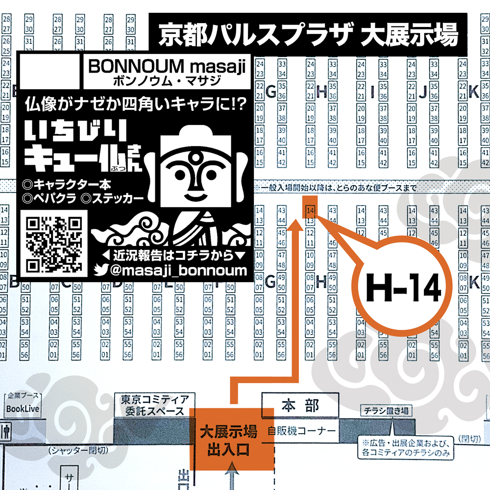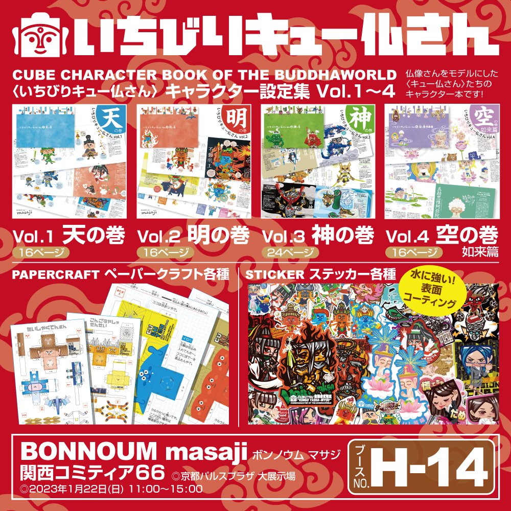 1/22(日) #関西コミティア66 に参加します キュー仏本に加え、ペパクラやステッカーもよろしく!京都は初めてなので楽しみでござる 🍀京都パルスプラザ 大展示場 🍀ブース:H-14 🍀サークル名:BONNOUMU masaji #キュー仏 #仏像イラスト