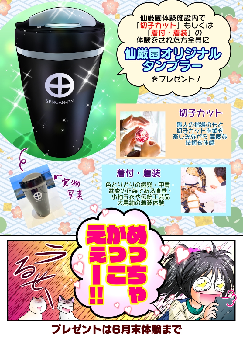 「仙厳園オリジナルタンブラー」がかっこよすぎです! 6月末までに体験施設で「切子カット」か「着付・着装」を体験するともらえるそうですよー✧*˖°+ mobile.twitter.com/senganen/statu… #漫画 #Web漫画 #鹿児島 #仙厳園 #これ目当てで体験する人絶対いると思う