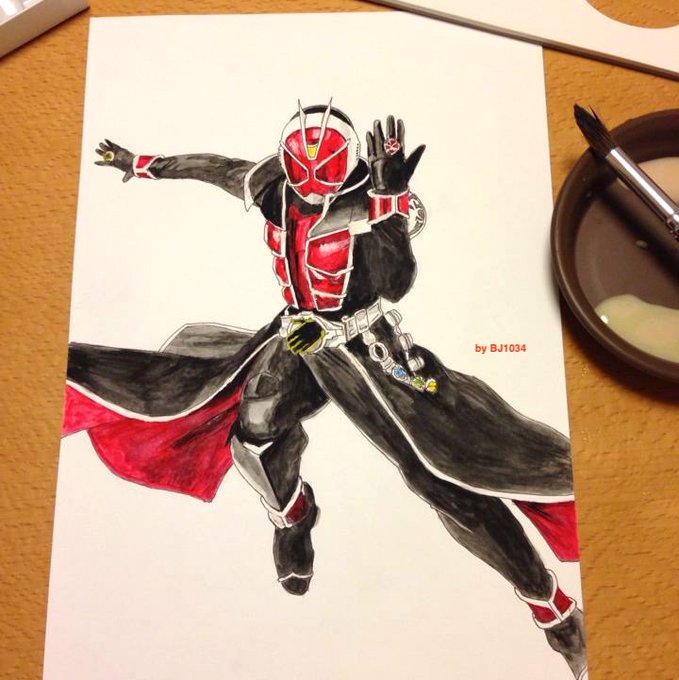 #仮面ライダーウィザード10周年 おめでとうございます!! 息子が2歳の時、初めて出会った「仮面ライダー」は「指輪の魔法使い」でした。本当にかっこよくて親子4人でどハマりしました。ウィザードリングもドライバーも全部あります。 てなわけでその頃水彩で描いたウィザード。
