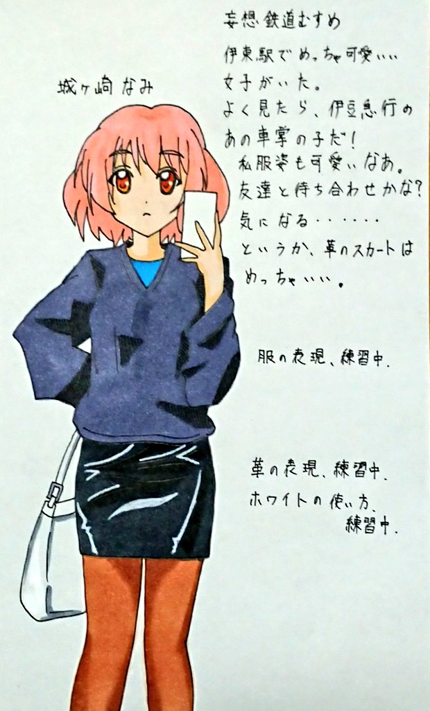 伊豆急行の城ヶ崎なみちゃんを描いた。 私服姿もまたいいものです。 革のスカート表現やらは、YouTubeを見ながら勉強中です。 妄想鉄道むすめもよろしくお願いいたします。 さて、次は誰を描くかな? #鉄むす版深夜の真剣お絵描き60分一本勝負 #鉄道むすめ #伊豆急行