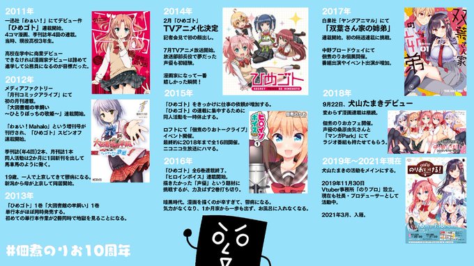 📝2021.11.25 佃煮のりおデビュー10周年を迎えました🌞 2011年の今日、高校3年生だった頃に TVアニメ化もしたデビュー作「ひめゴト」が商業誌に掲載されました✍✨ 現在は漫画家業は開店休業中ですが…😅 「のりプロ」の社長として今後も頑張ります! 応援よろしくお願いします! #佃煮のりお10周年
