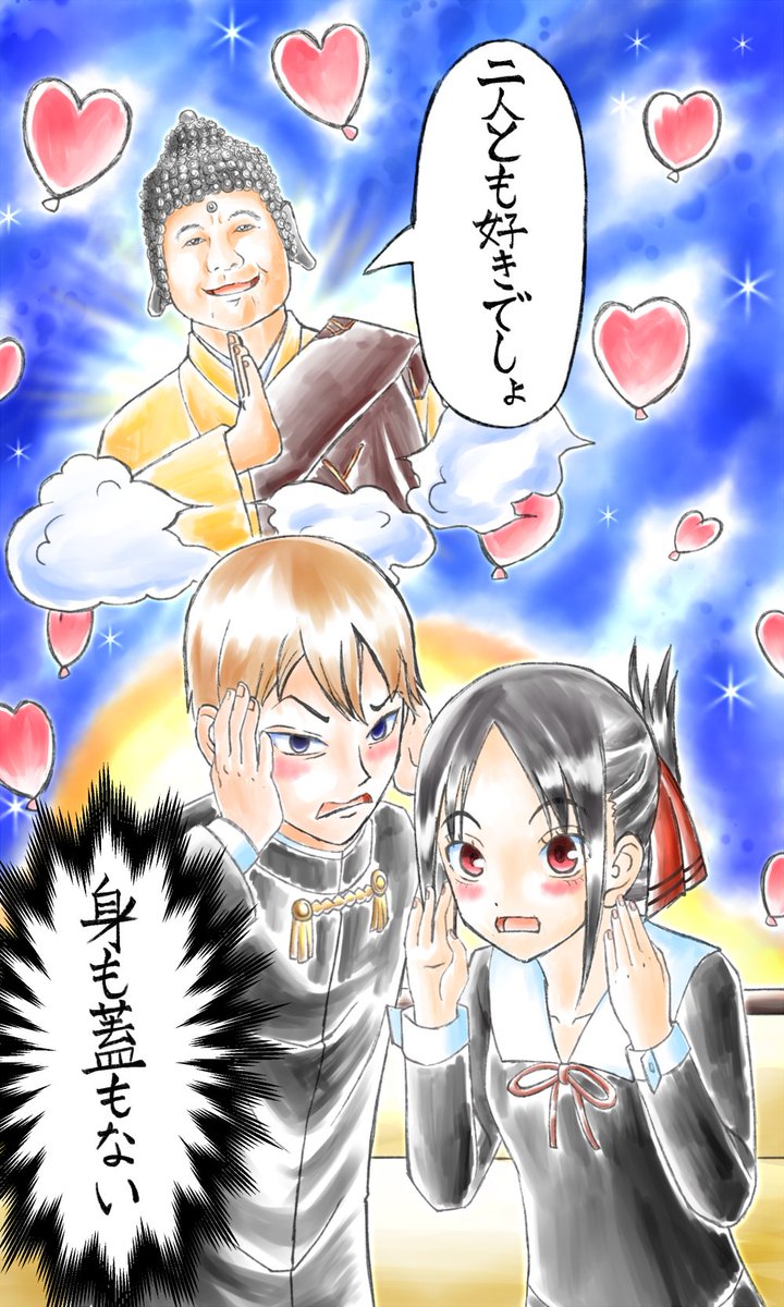 今日のお絵かき 完成 #かぐや様は告らせたい より #四宮かぐや と #白銀御行 と #勇者ヨシヒコ より #仏 仏「というかさ、二人とももう付き合っちゃいなよ!ていうか、付き合うぅ❣️ 仏、恋のキューピットだから、どうなの?」 #佐藤二朗 #絵描きさんと繋がりたい #イラスト好きな人と繋がりたい