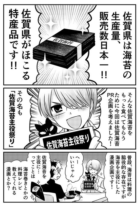 いつもの擬人化佐賀君&福岡君で 佐賀海苔主役祭りまんが。 企画書の佐賀海苔設定画は本当にこれでした。 佐賀県ヤバイ。 sagaprise.jp/saganorishuyak… rakuten.ne.jp/gold/sagamarch… この漫画はいつも通り作者の趣味で描いてる だけなので公式に怒られたら消します。 #佐賀海苔主役祭り #佐賀県